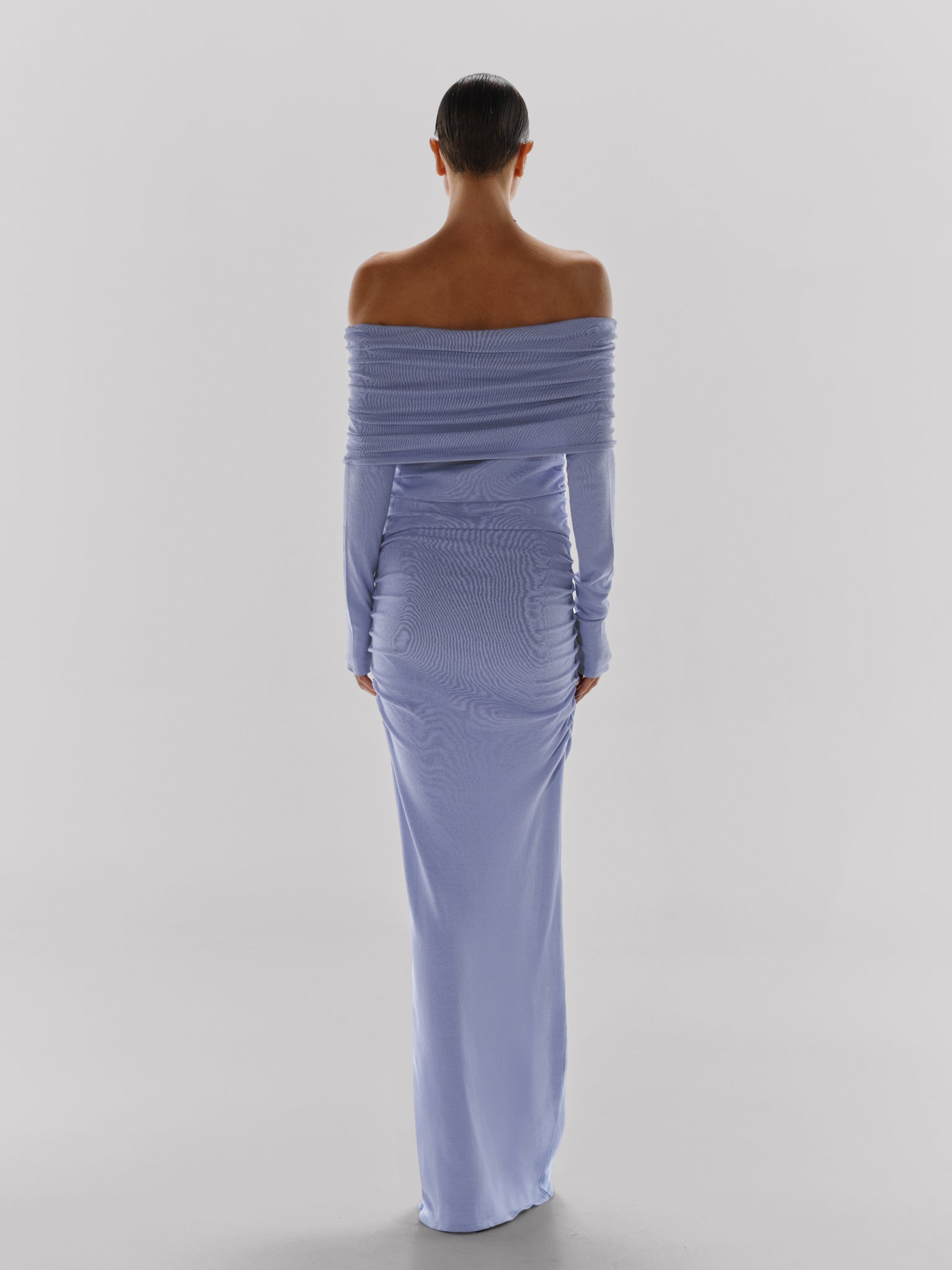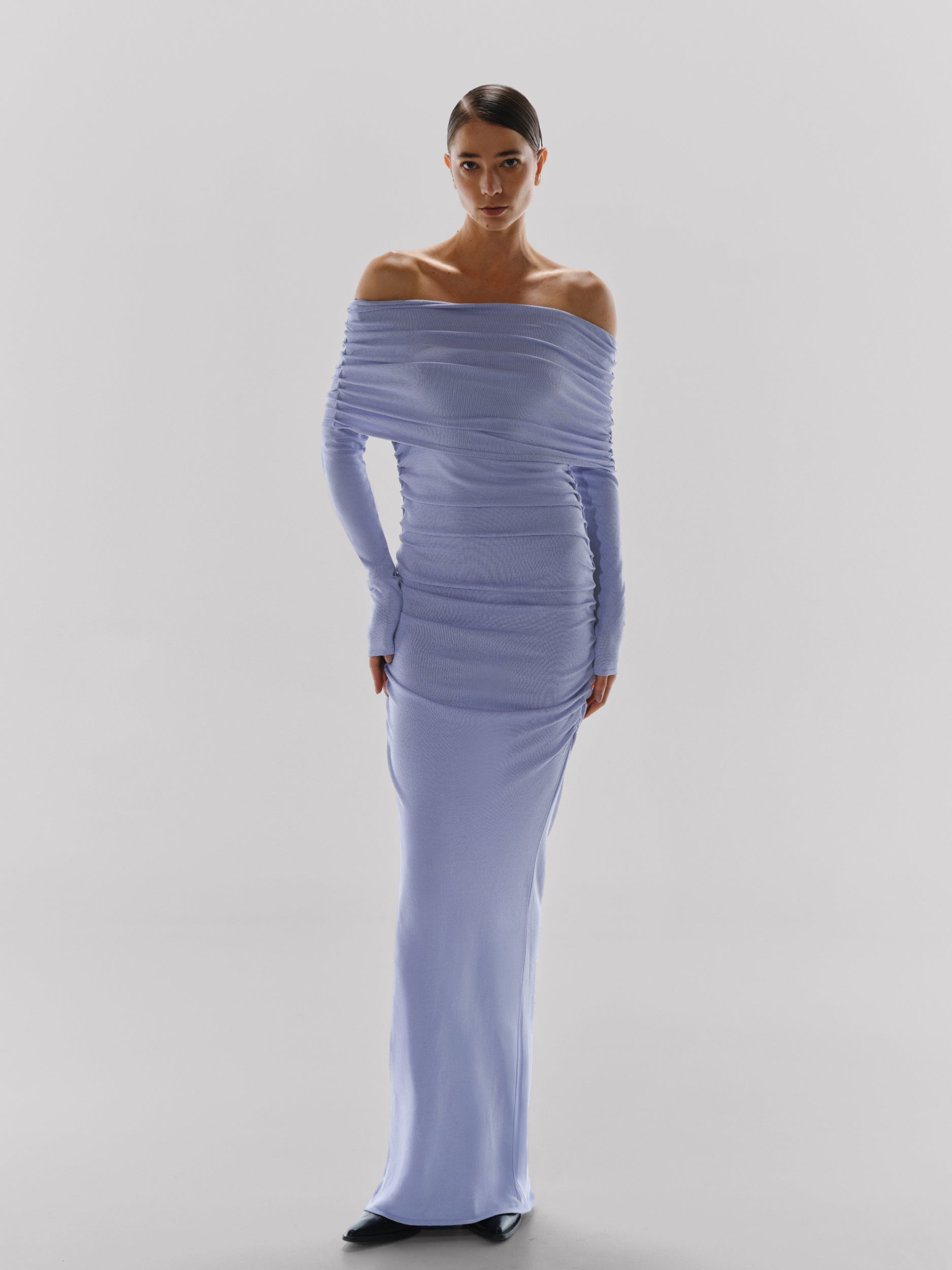 Introducing the "Fuji Dress" in Malva – this long-sleeve off the shoulder maxi dress exudes effortless elegance with its draped and ruched silhouette. Crafted from a knit fabric, it combines comfort with a touch of sophistication. Perfect for any occasion where you want to showcase both style and ease.