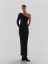 Introducing the "Kairi Dress" in Coal – A one-shoulder maxi dress with draped detailing at the front that creates a flattering, elegant silhouette. The design adds sophistication and sleekness, making it the ideal choice for day-to-night events. The fitted shape contours closely to the body, enhancing your natural curves.
