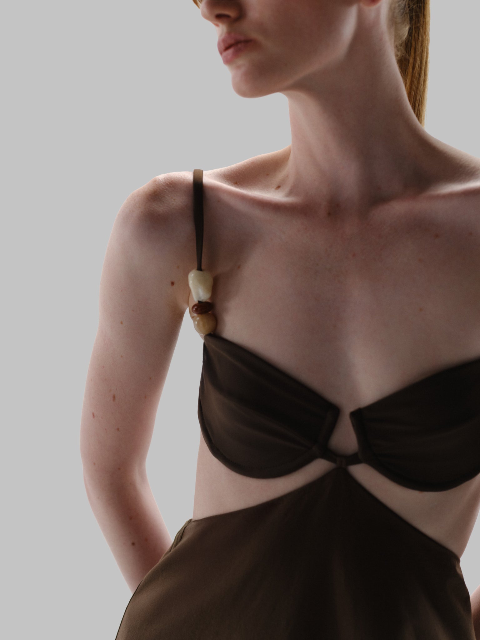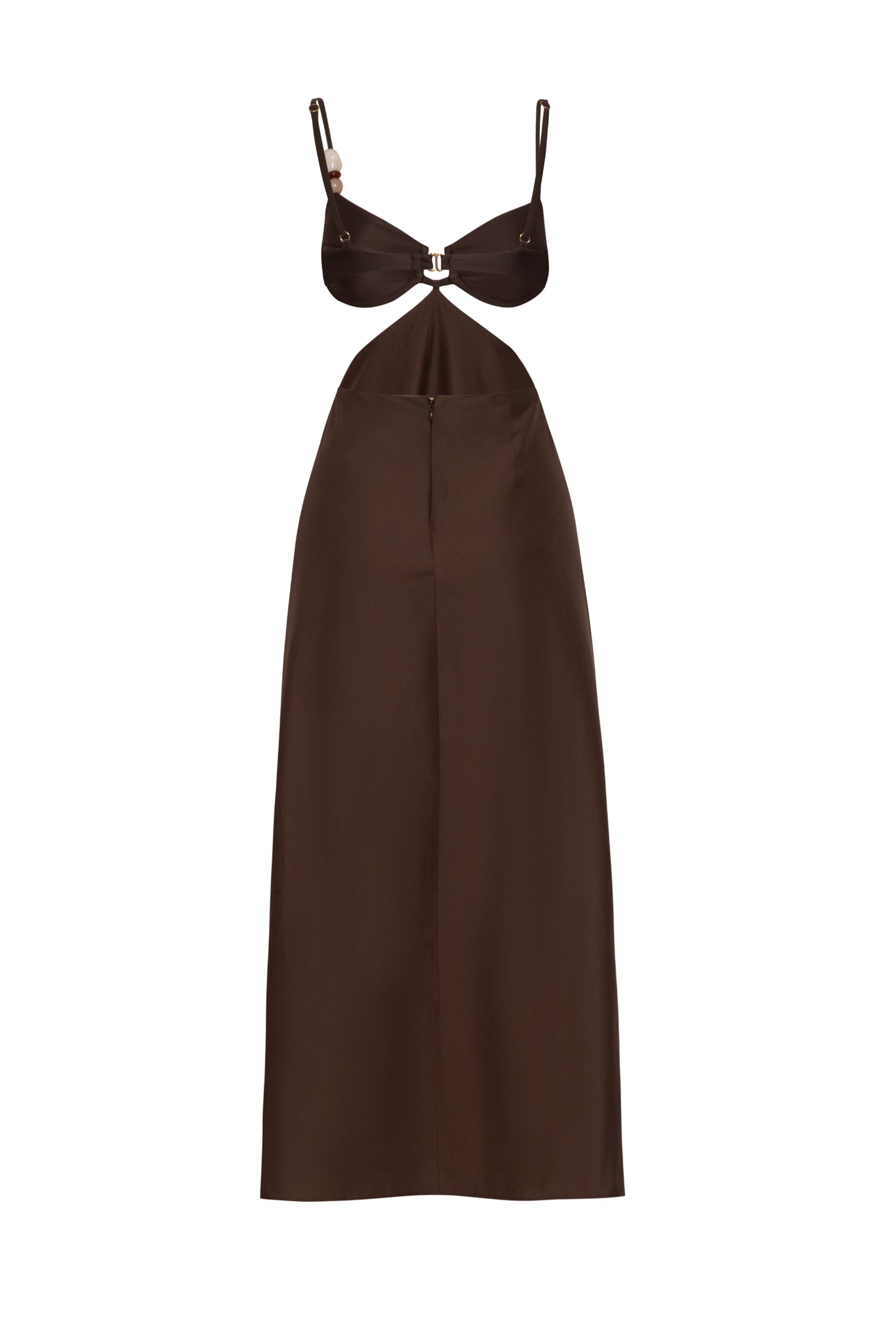 Introducing the “Kalina Maxi Dress” in Café Villa Rica – a balconette neckline design with an open back and adjustable straps, accented with resin stones on one strap. Featuring front cutouts and structured with underwire for added support. Finished with a back hook and zipper closure, fully lined, and designed in a maxi length.