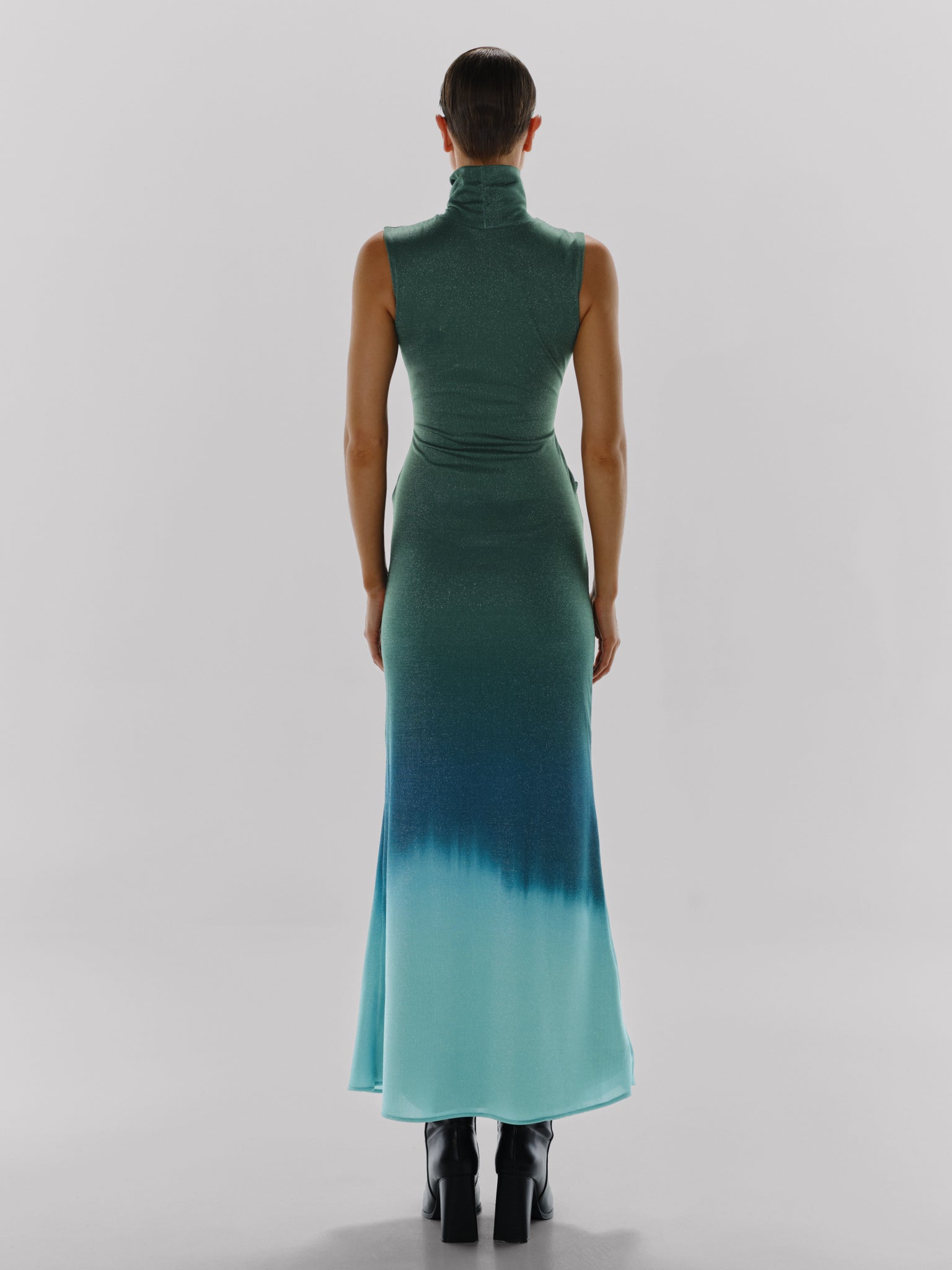 Introducing the "Leo Dress" in Tide – This elegant maxi dress features a high neckline and front knot detail for a touch of modern flair. The ruched design enhances its flattering silhouette, while the lined construction ensures comfort. A sophisticated and stylish choice for any special occasion.