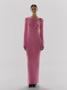 Introducing the "Ruby Maxi Dress" in Guava – a maxi dress with a round neckline and side cutout detail. Designed in knitted fabric with flared cuffs for added movement. Includes a matching top for versatile styling. Unlined for a lightweight feel.