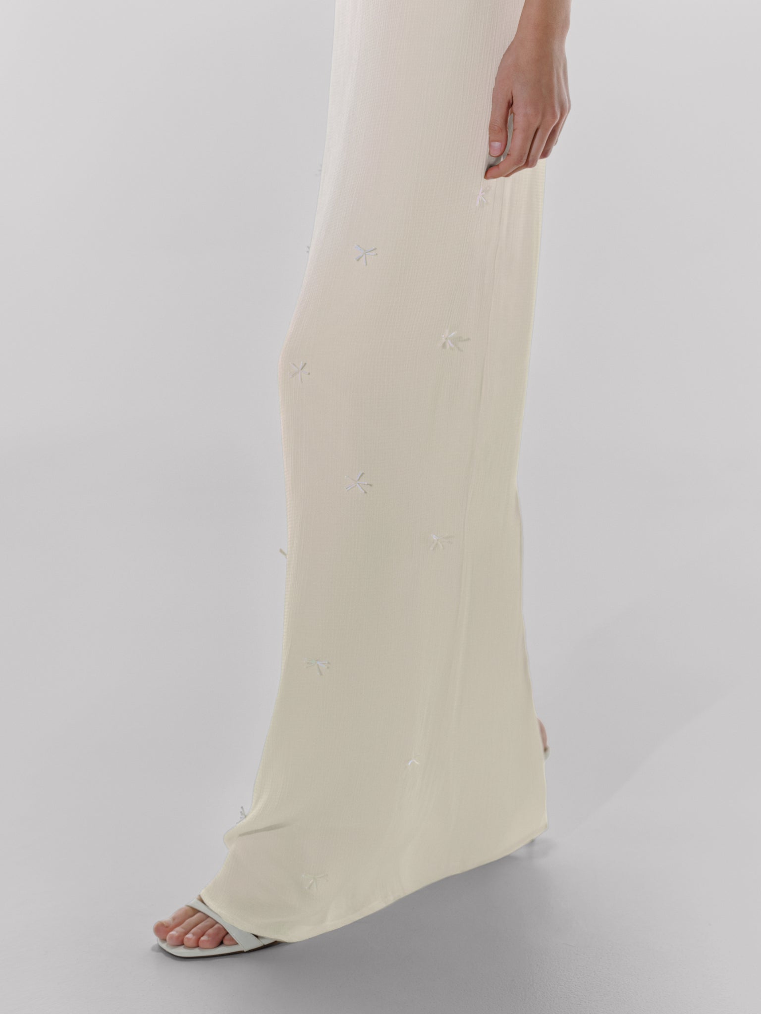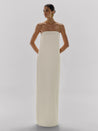 Introducing the "Sage Maxi Dress" in Ivory – a strapless, embellished maxi dress crafted in textured fabric. Features side boning, an elastic silicone grip for support, and a back slit for ease of movement. Finished with a back zipper and full lining.