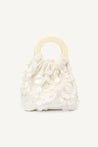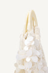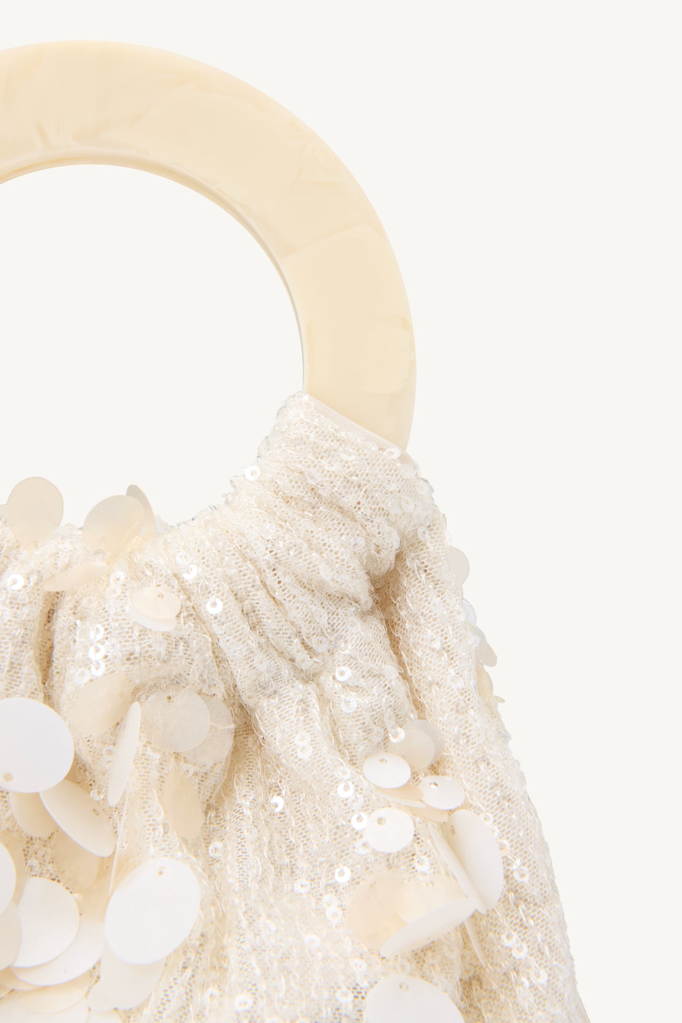 Sequin party bag featuring resin handles, crafted from polyester with epoxy resin handles.