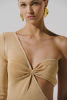Introducing the "Lu Dress" in Piel - An ankle-length silhouette, ensuring an elegant and eye-catching look. The exposed shoulder and asymmetrical cut combine to create an ultra-flattering effect on the body, imparting a graceful sophistication to the overall appearance.