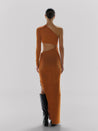 Introducing the "Catira Dress" in Marron Ð a stunning long-sleeve ribbed knit dress. The unique one-shoulder cut adds a bold touch, revealing a hint of skin. With its figure-hugging silhouette that accentuates your curves and its sophisticated midi length, it strikes the perfect balance between elegance and daring. Ideal for making a statement at any event.