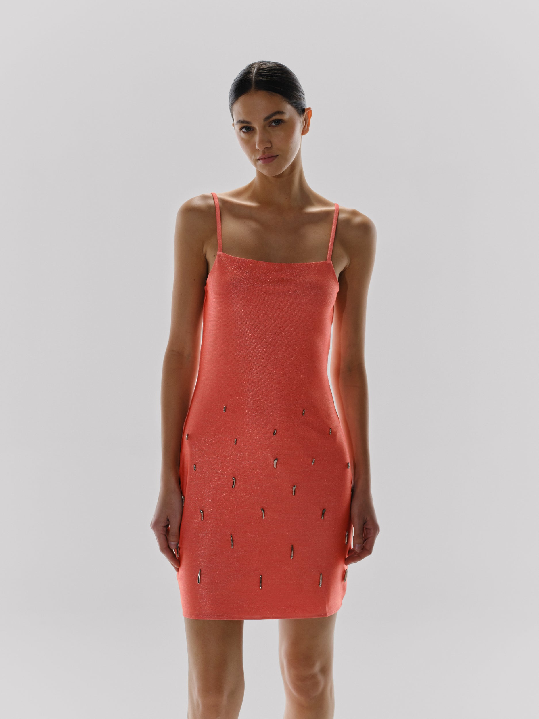 Introducing the "Cale Mini Dress" in Cantaloupe Ð a stunning piece that effortlessly combines elegance and style. This mini dress features intricate irregular bead embellishments at the bottom, adding a touch of sparkle and uniqueness. The square neckline and thin shoulder straps create a modern, flattering look. The fitted silhouette with a defined waist accentuates your figure. Perfect for special occasions, this dress is designed to make you stand out.