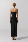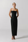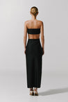 Introducing the "Mambo Maxi Dress" in Black – a strapless maxi dress with side cutouts, open back, and side boning for structure. Can be worn both ways, with cutouts at the front or back. Finished with a high side slit and partial lining.