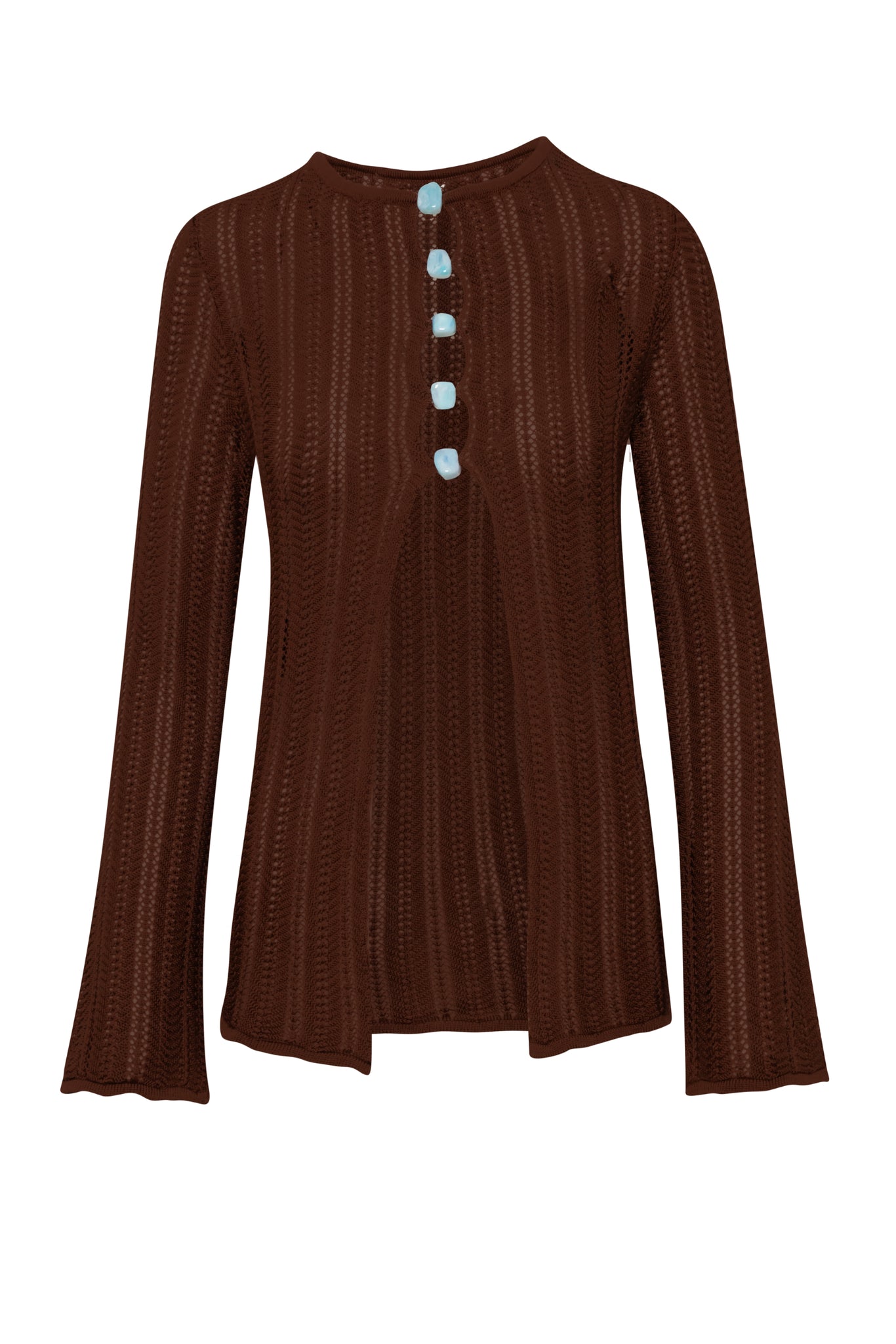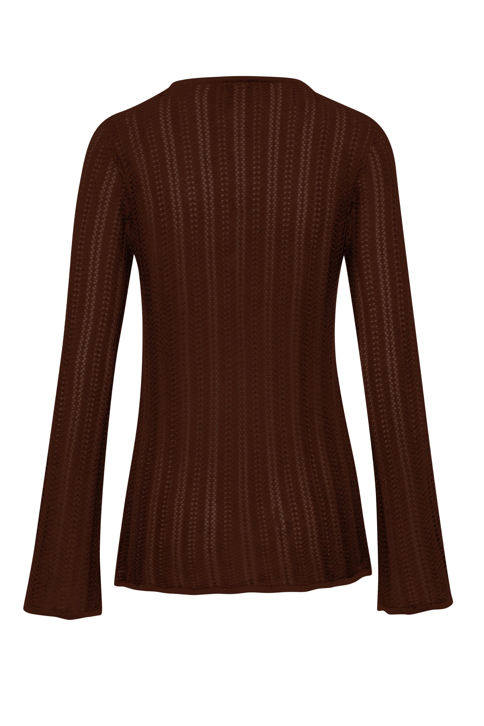Hand wash the garment inside out in cold water for 5–10 minutes. Rinse gently and lay flat to dry in the shade to maintain its shape. Avoid tumble drying, bleach, dry cleaning, and high temperatures. Put on your jewelry afterward and avoid contact with rough surfaces or accessories. Store knitwear folded to prevent stretching or losing its shape.
