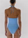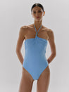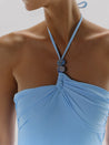 Introducing the "Bari One Piece" in Misty Blue – a halter neckline silhouette with ruched detailing and embellished accent. Designed with side boning for structure, fully lined for comfort, with no underwire or padding.