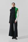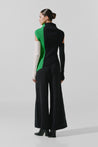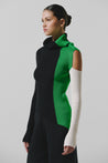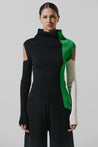 Introducing the "Kaori Top" in Greenwich – this long-sleeve color-blocked top features a sophisticated high neck. Cut-out details at the shoulders add a modern twist, creating a striking balance between classic elegance and contemporary style, perfect for any occasion.