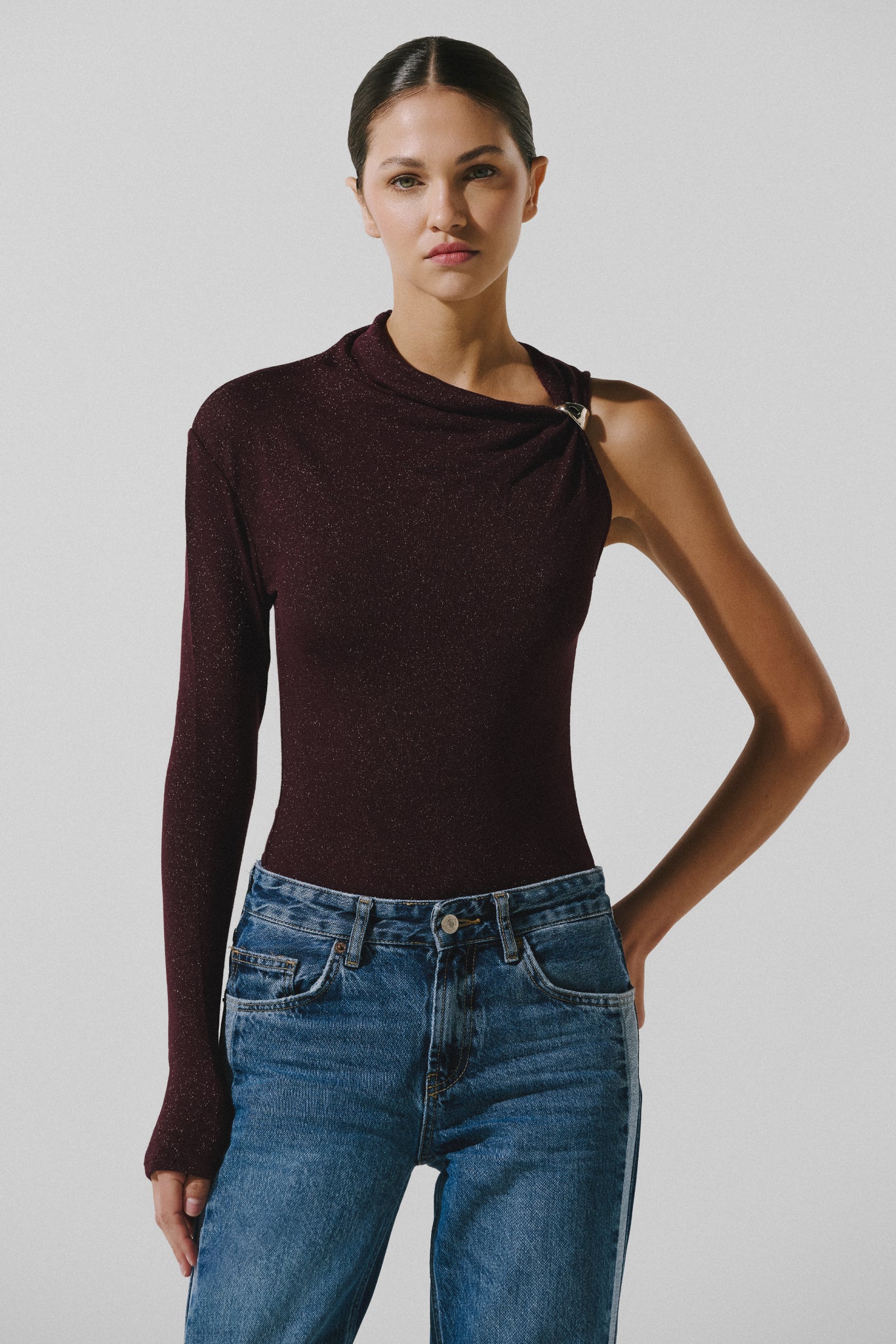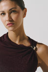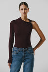Introducing the "Komae Body" in Cereza – designed with a one shoulder silhouette, this bodysuit features an elegantly draped neckline and ruching at the waist, accented by intricate embellishments. The glossy fabric and signature Baobab-shaped detail at the shoulder make it a standout piece for any occasion.