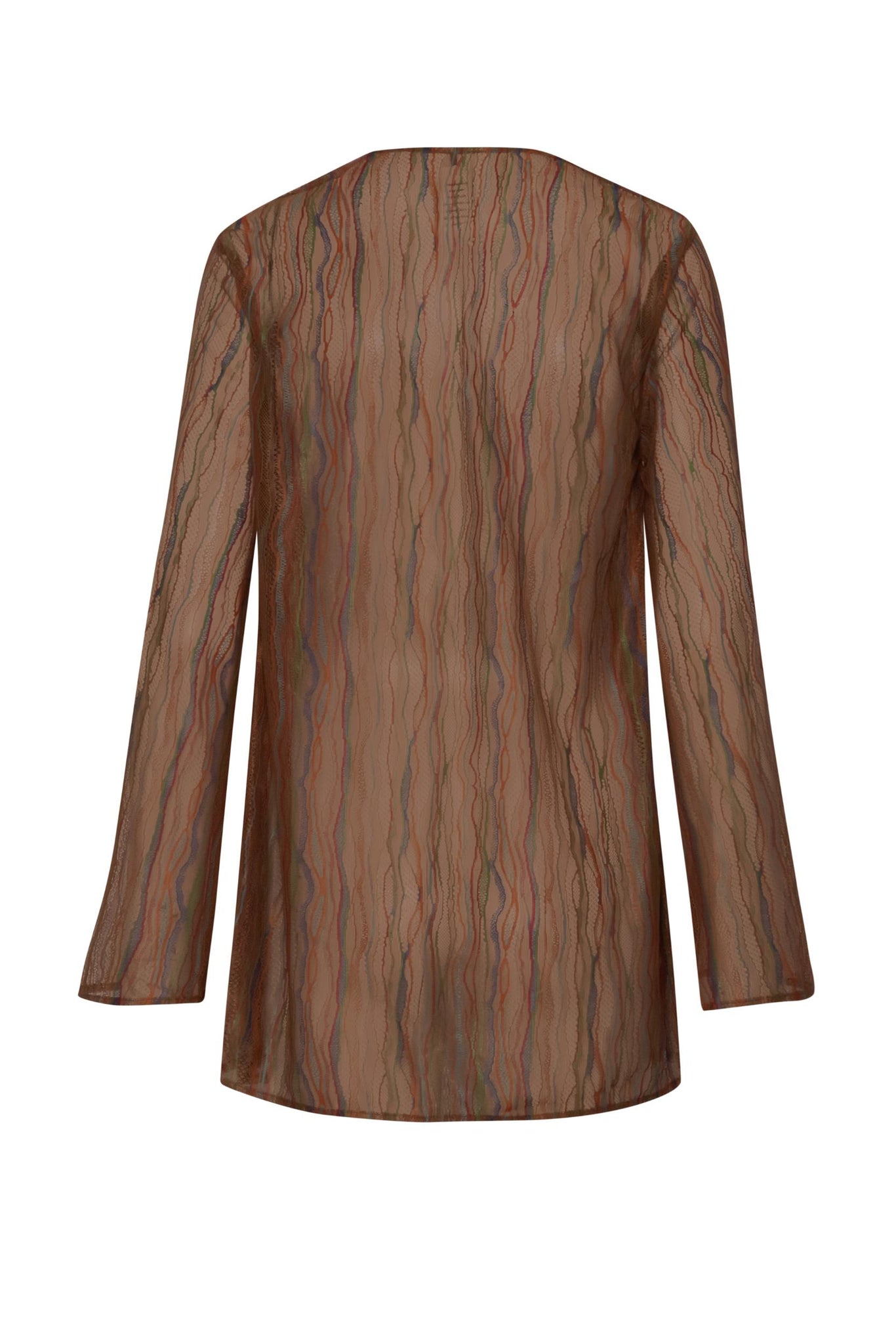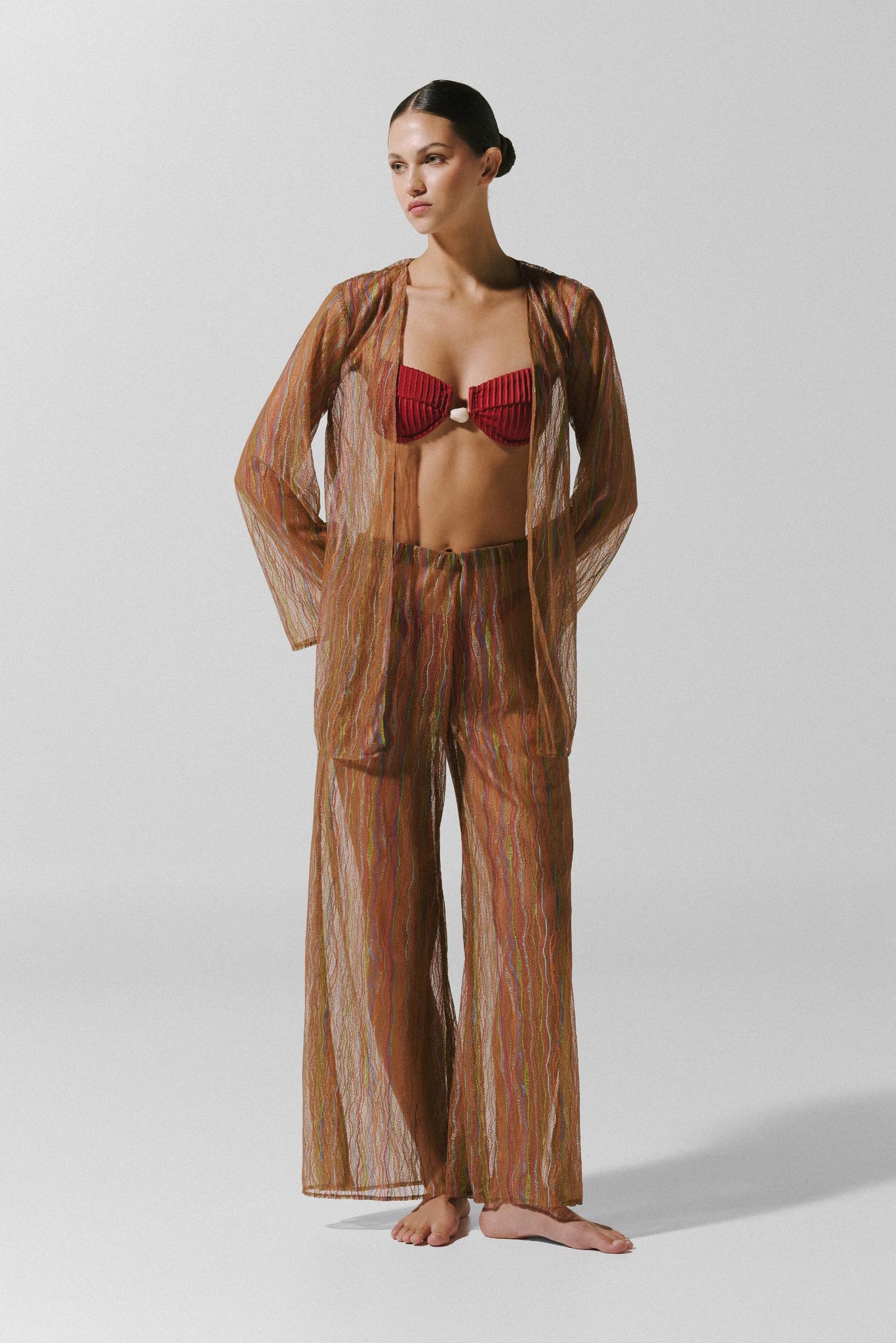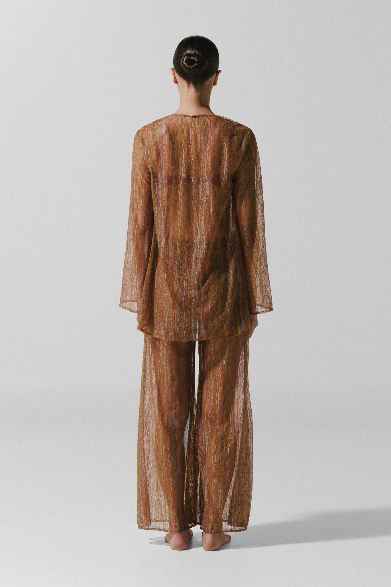 Introducing the “Gola Shirt” in Vinicunca – a V-neckline silhouette designed with effortless allure. Featuring long sleeves, a front tie knot, and a subtle front slit for added movement. Crafted in sheer lace fabric and finished with an unlined construction for a lightweight, statement feel. Pair it with the matching pants for a coordinated look.
