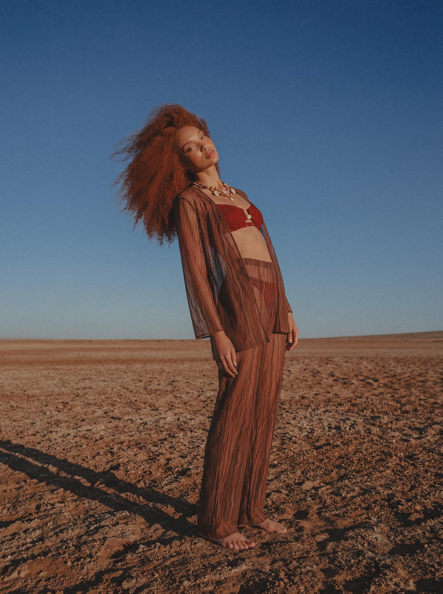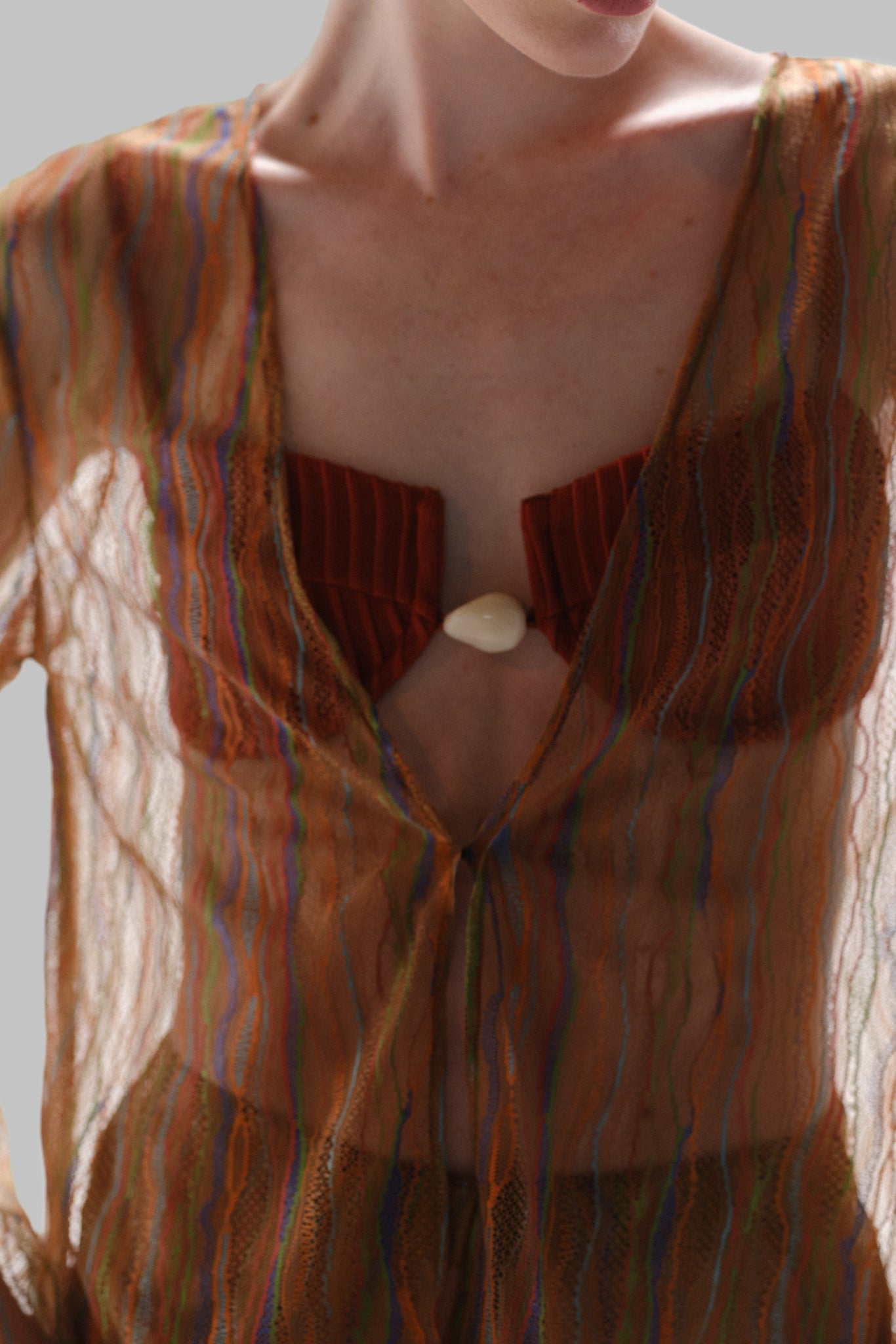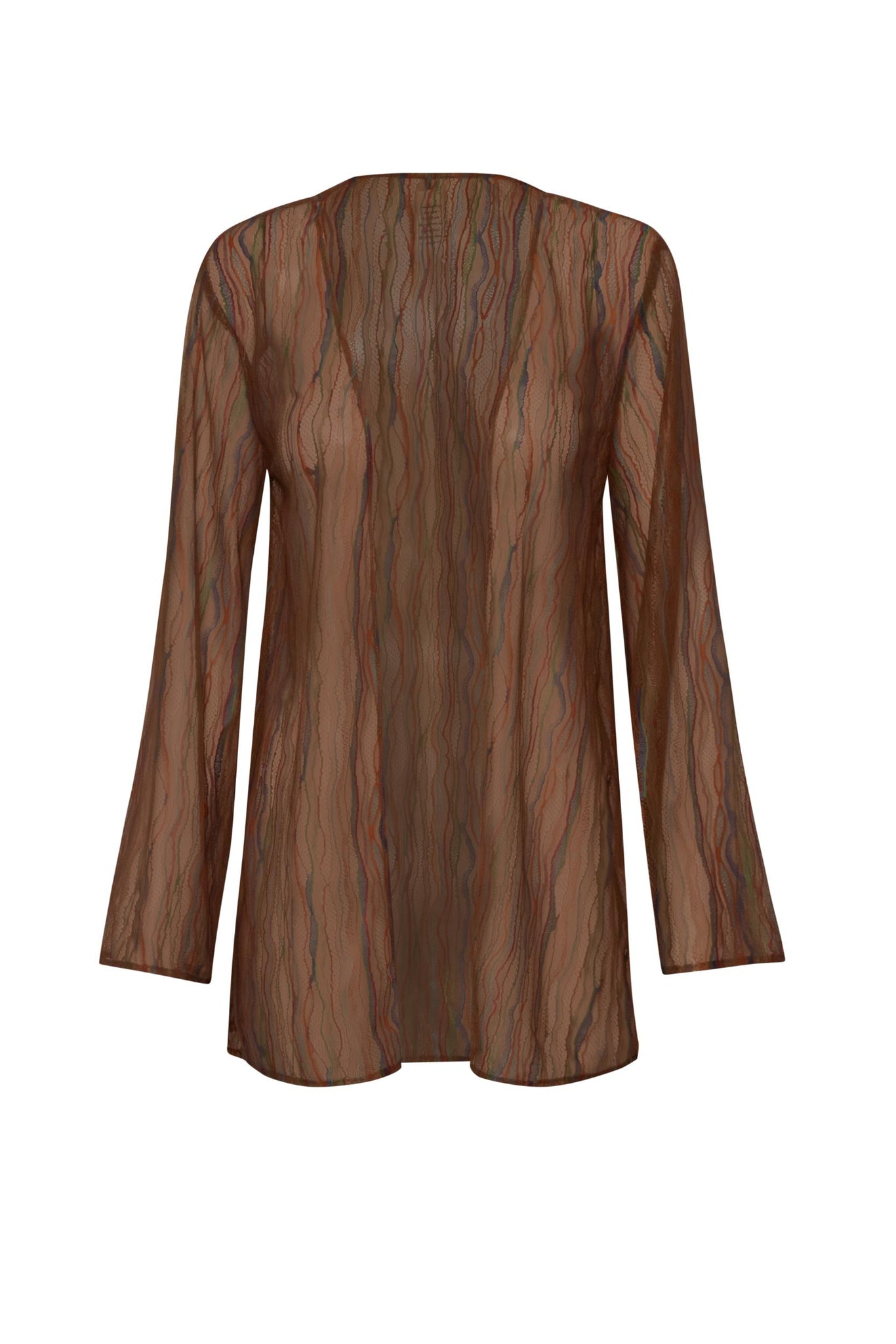 Introducing the “Gola Shirt” in Vinicunca – a V-neckline silhouette designed with effortless allure. Featuring long sleeves, a front tie knot, and a subtle front slit for added movement. Crafted in sheer lace fabric and finished with an unlined construction for a lightweight, statement feel. Pair it with the matching pants for a coordinated look.