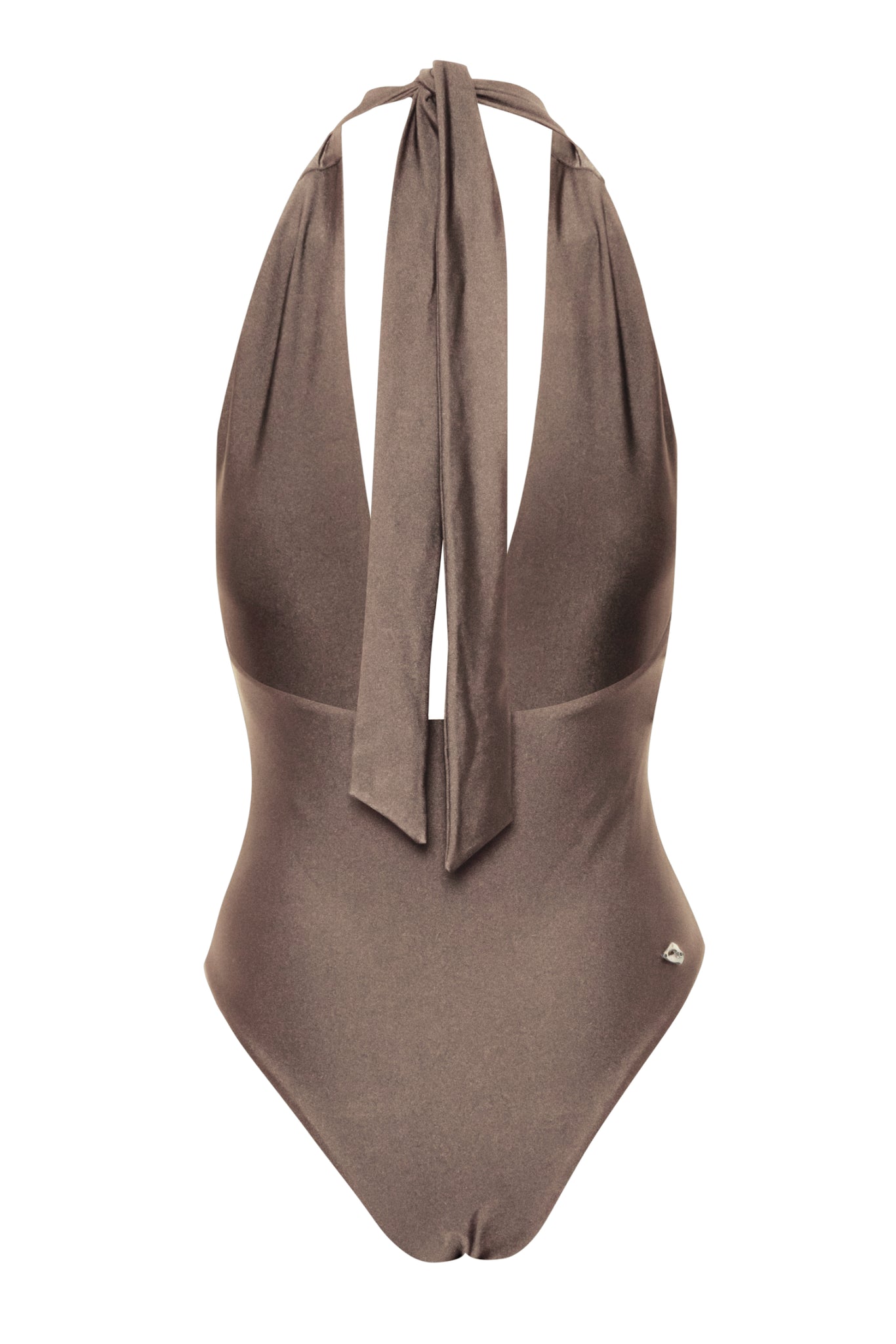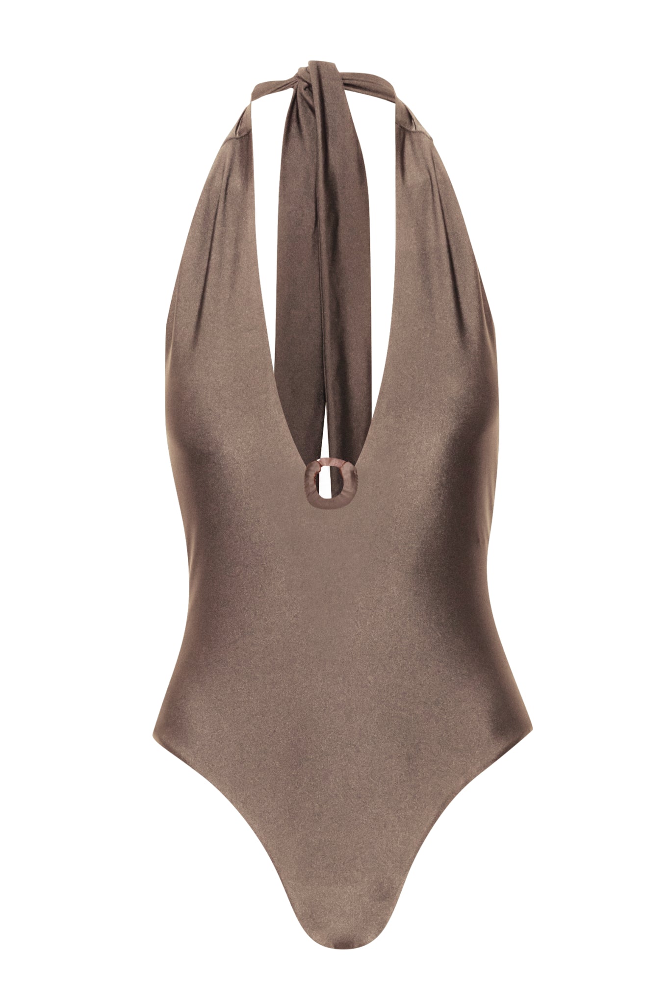 Introducing the “Chivi One Piece” in Terra – a halter neckline design with an open back and self-tie straps. Features a ring detail, side boning for support, an unpadded construction, and medium coverage. Finished with a fully lined construction.