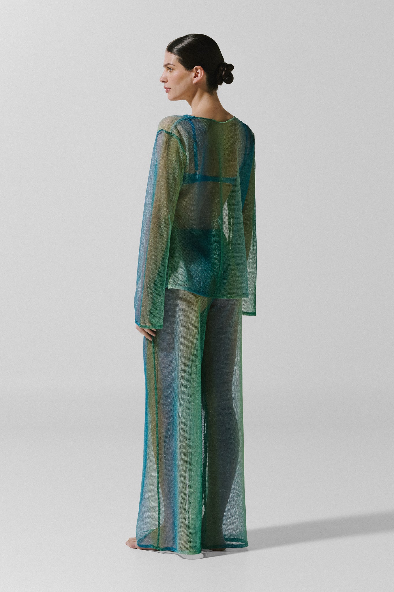 Introducing the "Gem Shirt" in Moss Green β a sheer design crafted in shiny mesh fabric. Features long sleeves with a slight flare and a front hook closure. Unlined for a lightweight, translucent finish.