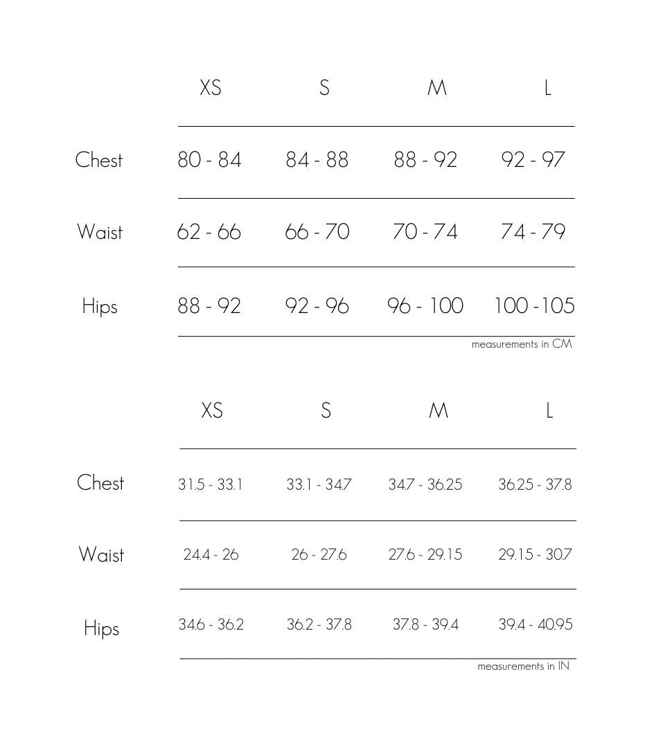Our Size Guide will help you find the perfect fit for each piece in our collection. Every body is unique, which is why we've designed this detailed guide to ensure you choose the size that best suits you. If you need further assistance, don't hesitate to contact us. We want you to feel comfortable and confident with your choice.