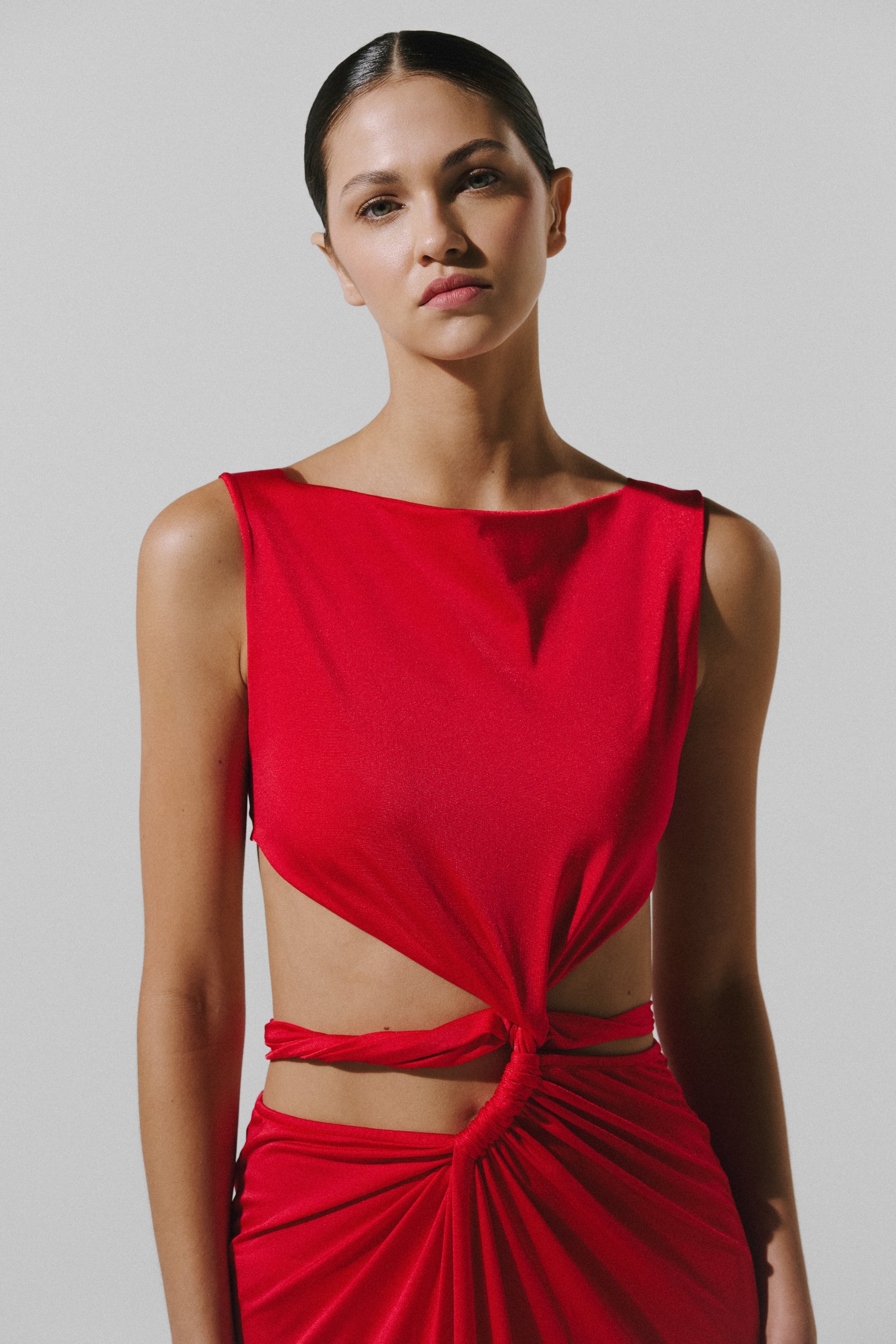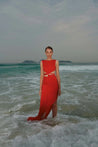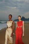 Introducing the "Ada Dress" in Jandira-ÊDesigned to enhance your resort wear collection, this high-neck maxi dress with ruched details and waist cut-outs embodies the essence of high-end. Made from a lycra figure-hugging glossy fabric, this dress elevate your beachside style. Immerse yourself in the captivating world of high-end resort wear.