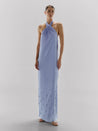 Introducing the "Amorino Dress" in Lilac Blue – a captivating maxi dress that blends a halter neck with an elegant low-back design. The high neck, adorned with crossed bands that tie at the back, drapes beautifully. Meanwhile, the low back adds a touch of allure, striking the perfect balance between classic and contemporary. The dress is embellished with irregular beads at the bottom, adding a unique and refined finish.