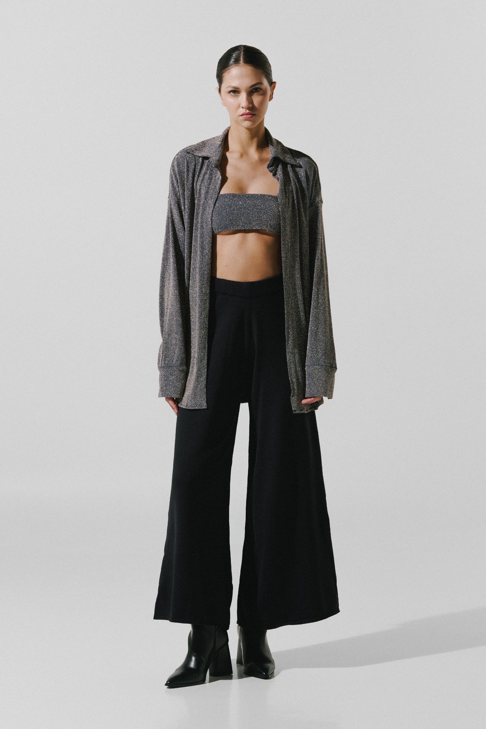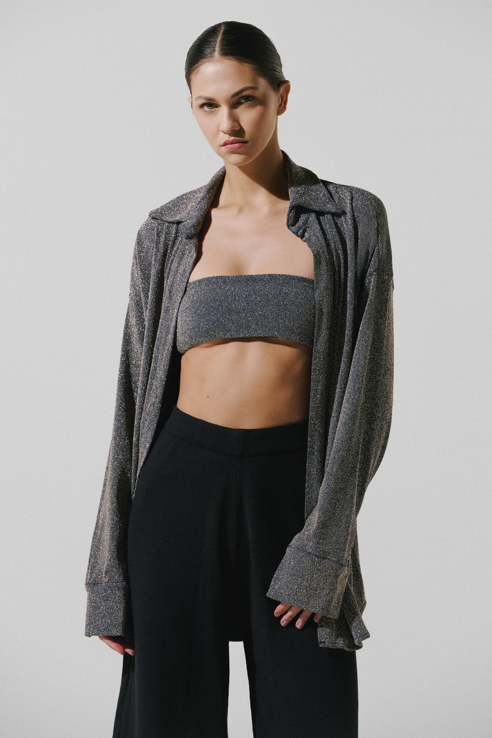 Introducing theÊ"Chivi Shirt" in DiscoÊ-ÊThis captivating resort wear ensemble exudes grace and sophistication, showcasing meticulous artistry and a strong commitment to sustainability. This glossy open shirt, when paired with the "Chivi Top" and "Chivi Bottom" in Disco, create a complete and stylish look. This three-piece set includes a bandeau top, a flowy shirt, and loose trousers, all in a glossy material. Elevate your beach-to-bar looks with our new favorite, the "Chivi Set."