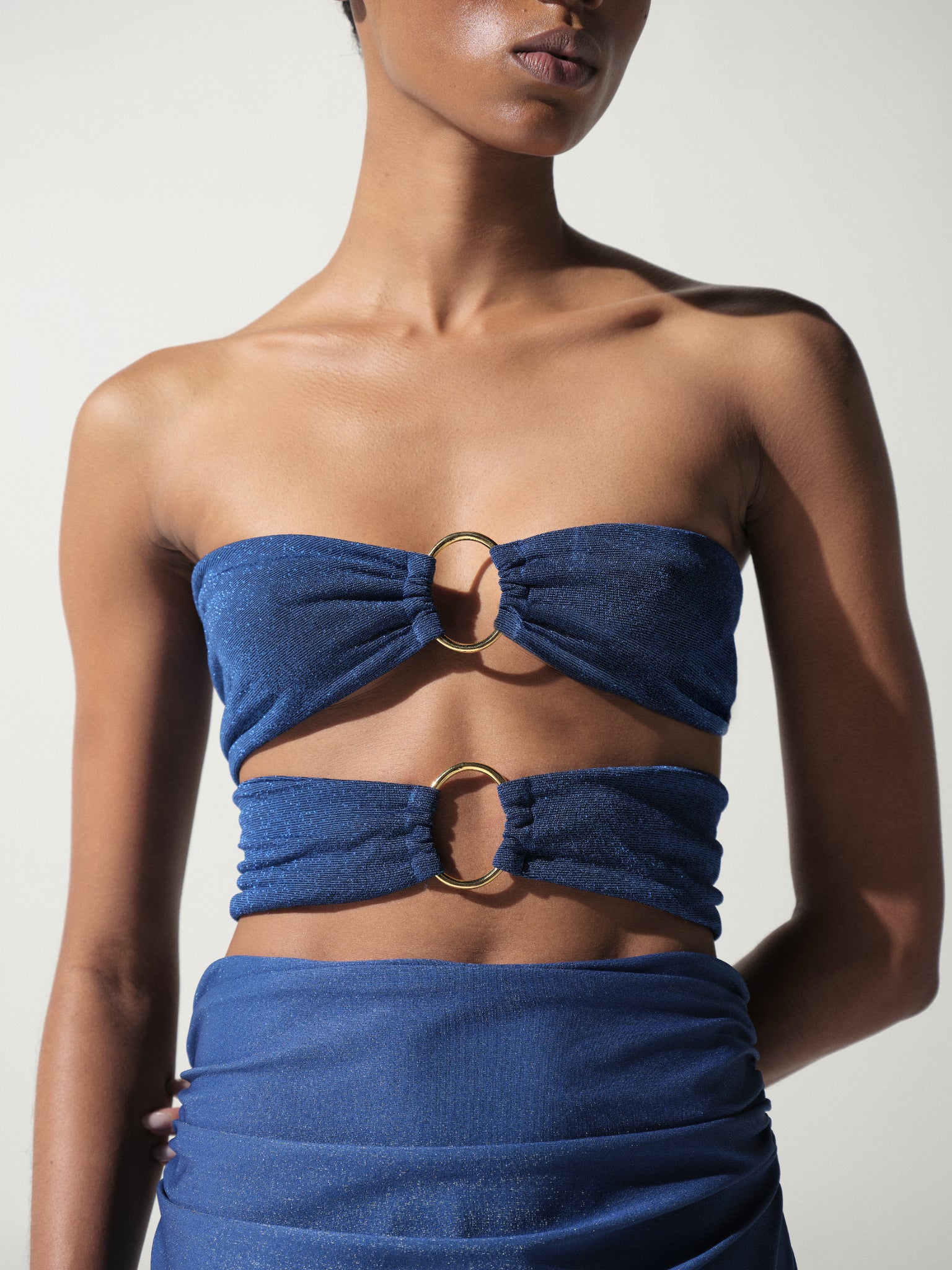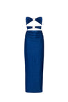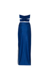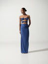 Introducing the "Isla Maxi Dress" in Dark Blue – a two-piece strapless design featuring front ring details and ruched accents that shape the silhouette. Defined by front cutouts and a side slit, fully lined and finished in a maxi length.
