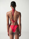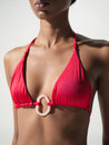Introducing the "Kaia Bikini Top" in Spicy Red – a triangle design with self-tie straps and baobab-shaped embellishment. Unpadded and without underwire, fully lined for a comfortable, natural fit. Pair it with the matching bottom for a coordinated look.