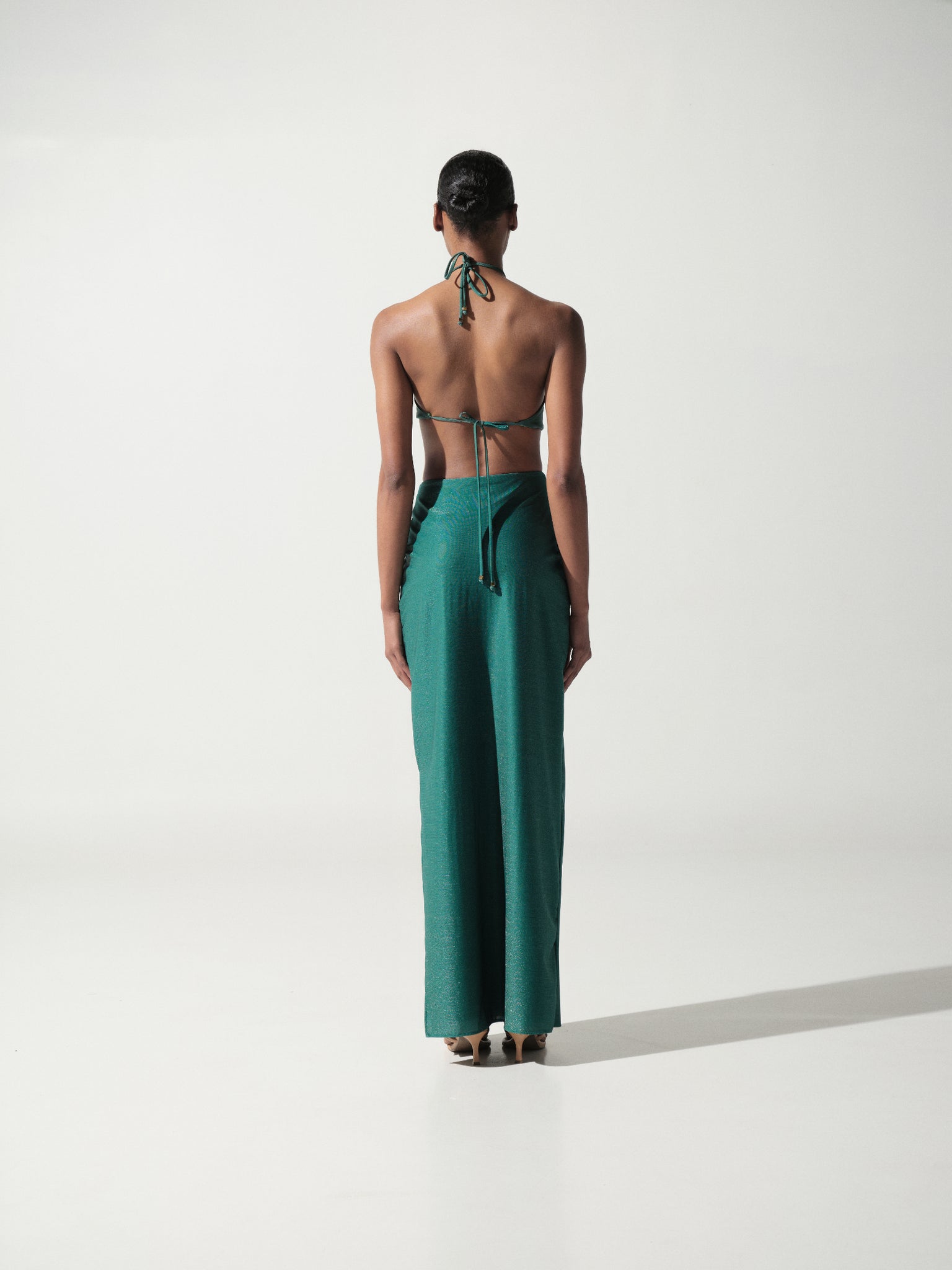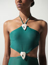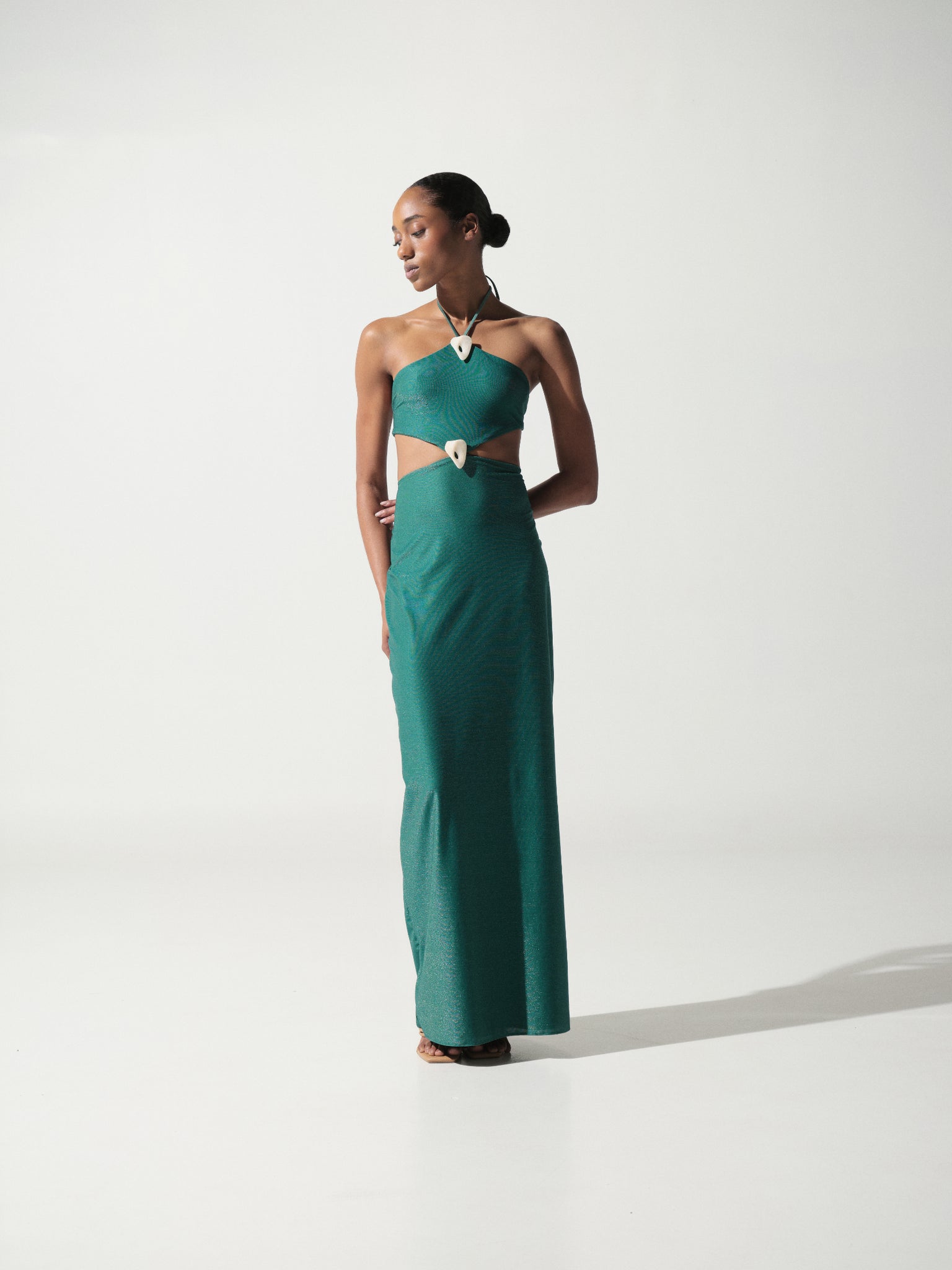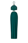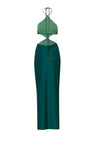 Introducing the "Kira Maxi Dress" in Emerald – a halter-neck design with an open back and Baobab-shaped embellishments at the front. Featuring side cutouts in a shiny fabric, fully lined and finished in a maxi length.
