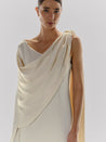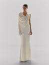 Introducing the "Kuma Dress" in Ivory – this one-shoulder maxi dress features a long scarf detail that gracefully extends from the shoulder, draped elegantly. The draped neckline complements the fitted skirt that flows to the floor, creating a stunning mermaid silhouette. The hint of sparkle in the fabric adds a touch of glamour, making it perfect for any special occasion.