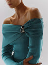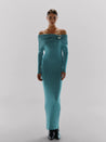 Introducing the "Kuta Dress" in Lagoons Ð this off the shoulder maxi dress features elegant draping and is crafted from knitted fabric. It includes a signature Baobab-shaped detail at the shoulder, adding a touch of unique sophistication. Perfect for making a statement at any event.