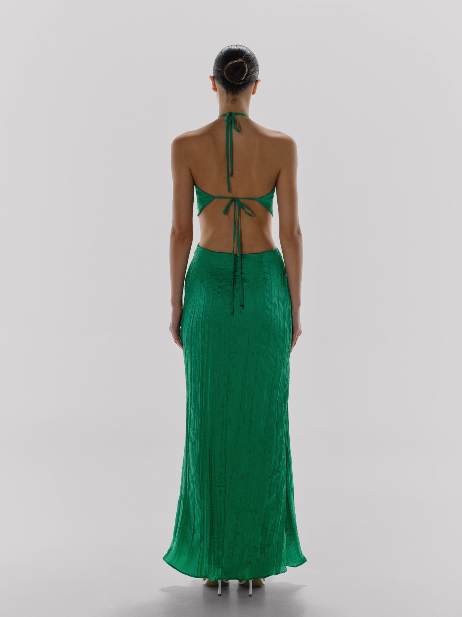 Introducing the "Lexi Maxi Dress" in Zircone Blue – a halter-neck silhouette with an open back and side cut-outs. Features a Baobab-shaped embellishment, back darts, and zipper closure. Crafted in textured fabric with full lining and a maxi length.