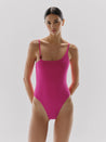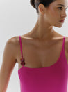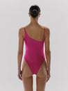 Introducing the "Lola One Piece" in Fucsia – an asymmetrical silhouette with a single adjustable strap and delicate embellishments. Fully lined for coverage and comfort, with no underwire or padding for a natural fit.