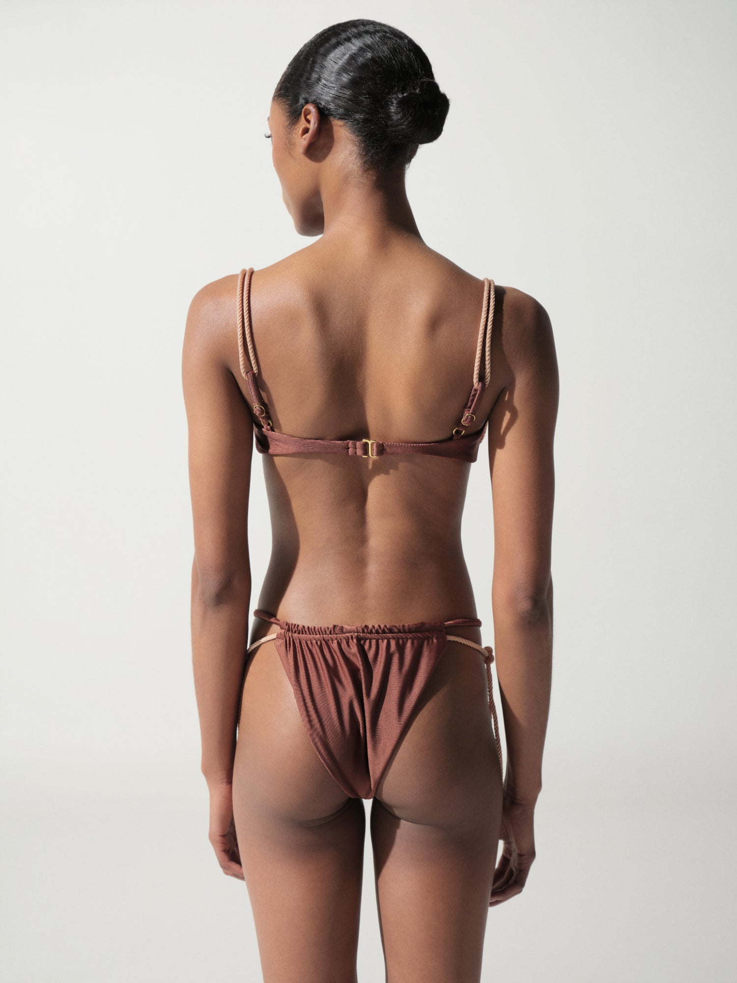Introducing the "Lula Bikini Bottom" in Coffee – a high-cut design with self-tie straps, adjustable coverage, and ruched detailing. Fully lined for a comfortable and secure fit. Pair it with the matching top for a coordinated look.