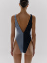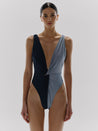 Introducing the "Lulu One Piece" in Blackberry – a one-piece swimsuit with a deep V-neckline and front knot detail. Designed with color block accents and a glossy fabric, it is fully lined for comfort and support.