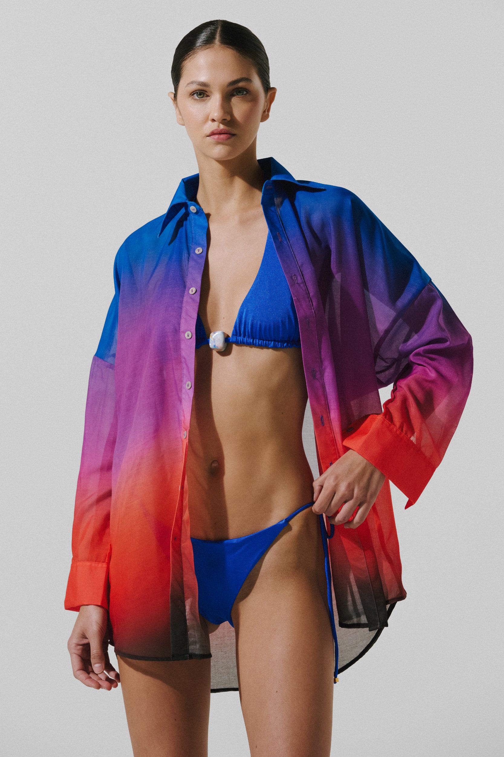 Introducing the "Lulu Shirt" in Northern Lights Ð this semi-transparent long-sleeve shirt features front buttons for a chic, versatile look. Perfect for layering over swimwear or pairing with your favorite denim, this shirt brings a fresh, airy vibe to your wardrobe.