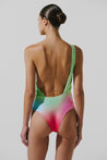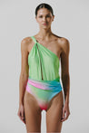 Introducing the "Oriana One-Piece" in Candy Swirl – A harmoniously designed one-shoulder swimsuit. Its asymmetric deep cut at the front and intricate pleated detailing create a captivating look. The open back adds an alluring touch while maintaining an overall sense of the lively color way. Made from a figure-hugging, stretchy fabric, this swimsuit embodies our commitment to sustainability.