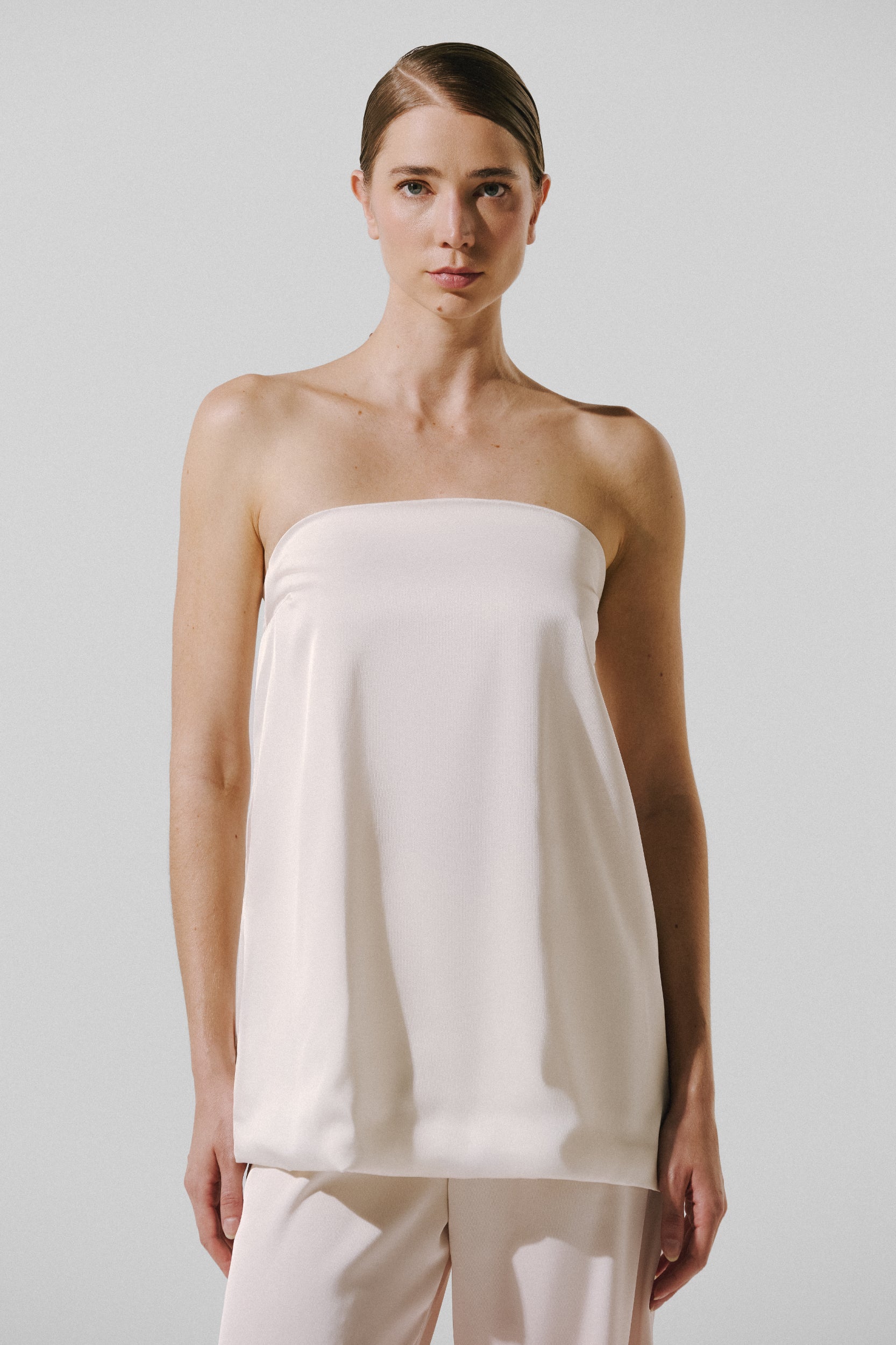 Introducing the "Suzu Top" in Milk – a strapless top with structured darts for a tailored fit. Designed with an elastic silicone grip for support and a side zipper closure for ease. Fully lined for coverage. Pair with matching pieces for a complete look.