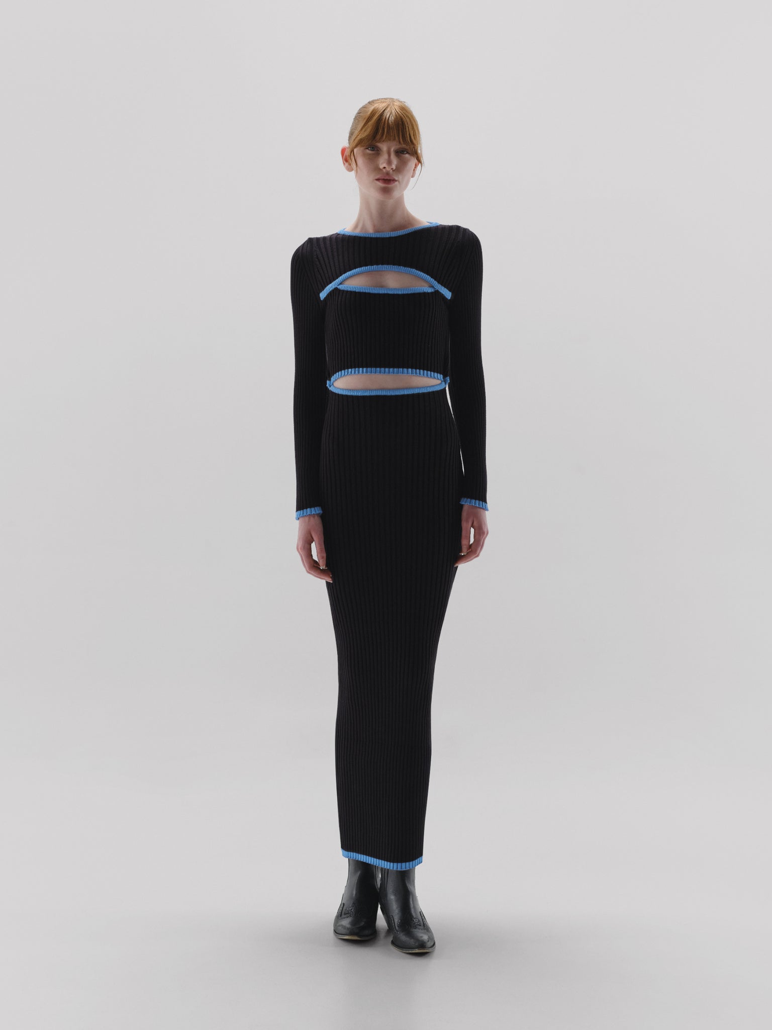 Introducing the "Taro Dress" in Dodger Ð this long-sleeve maxi dress features striking blue line detailing and bold asymmetric cut-outs. The unique design adds a modern edge, making it a standout choice for a chic and contemporary look.