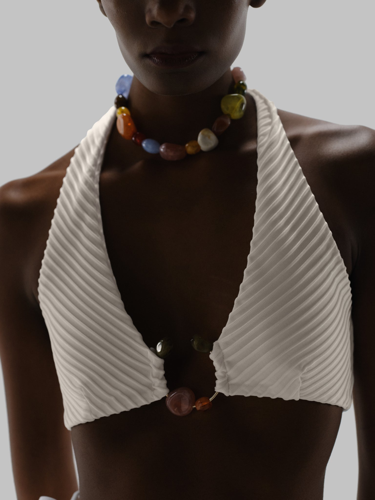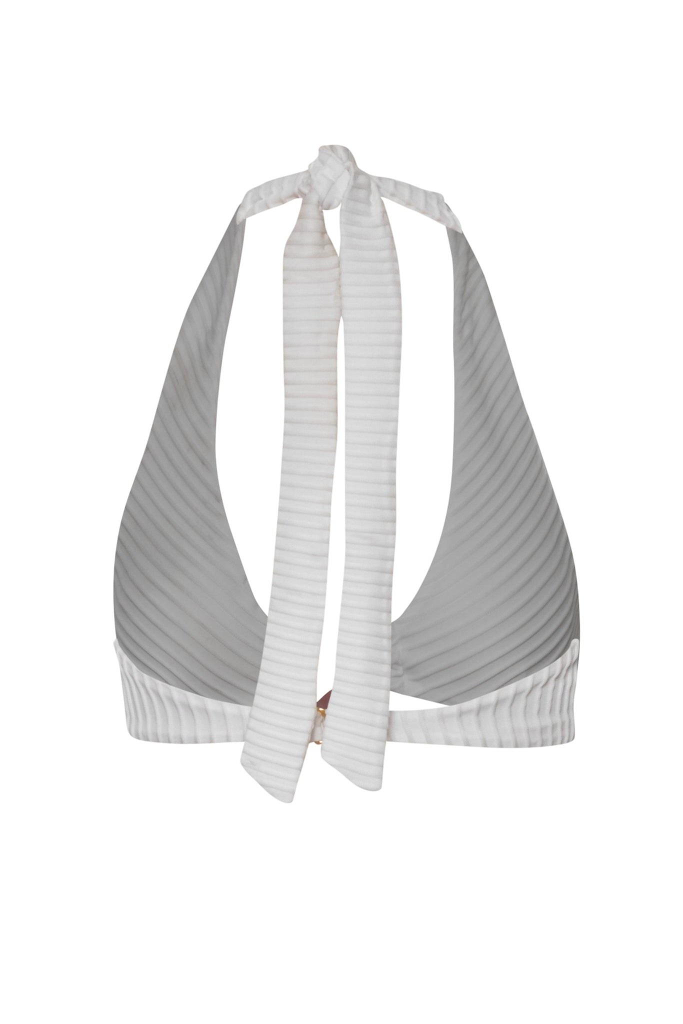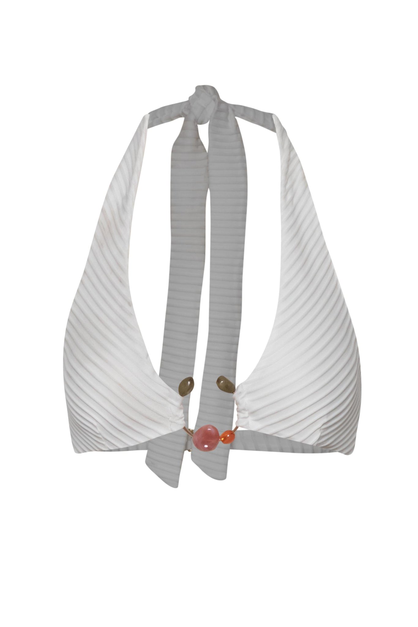 Introducing the “Zur Bikini Top” in Salina – a halter neckline silhouette with self-tie straps and a ring detail embellished with resin stones. Designed with darts at the top, silicone elastic for support, and a back hook closure. Crafted in textured fabric, unpadded and without underwire, and fully lined for comfort. Pair it with the matching bottom for a coordinated look.